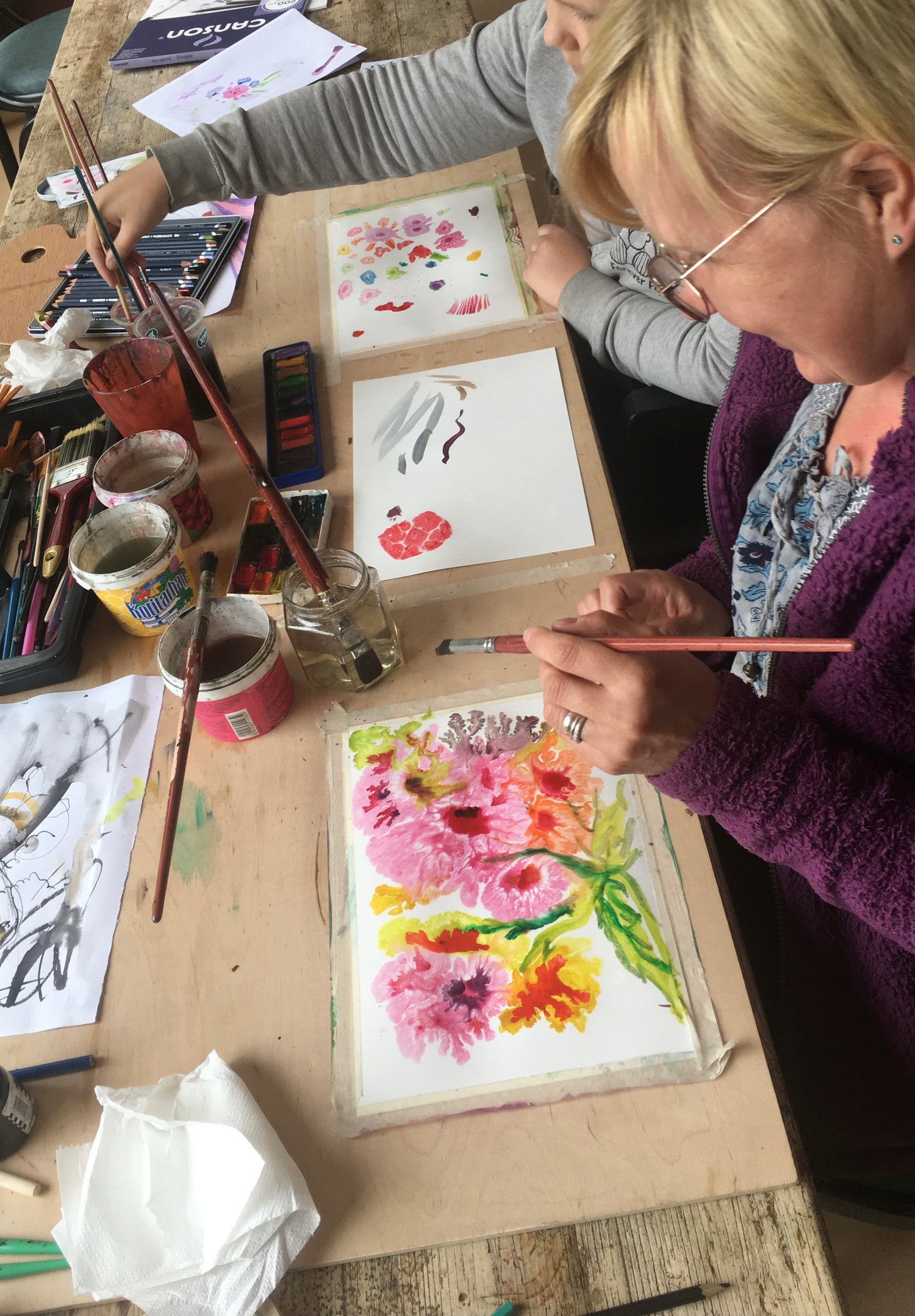 Svetlana Ruohon pitäämänsä maalaus- ja piirustuskurssit etänä ja paikan päällä työväenopistossa.