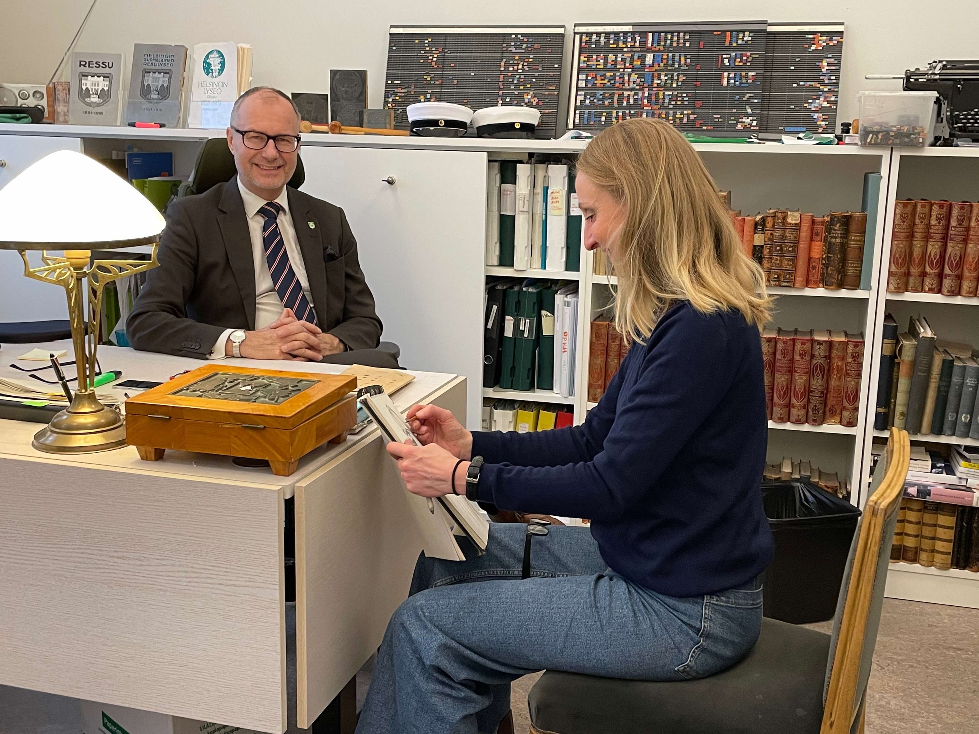 Positiivinen piirre, joka erottaa tekemäni teoksen aiemmista lukion rehtoreiden muotokuvista, on se, että maalauksessani on kuvattuna sekä henkilö että paikka, jossa Ari on työskennellyt ja tehnyt työtä suuren osan urastaan.