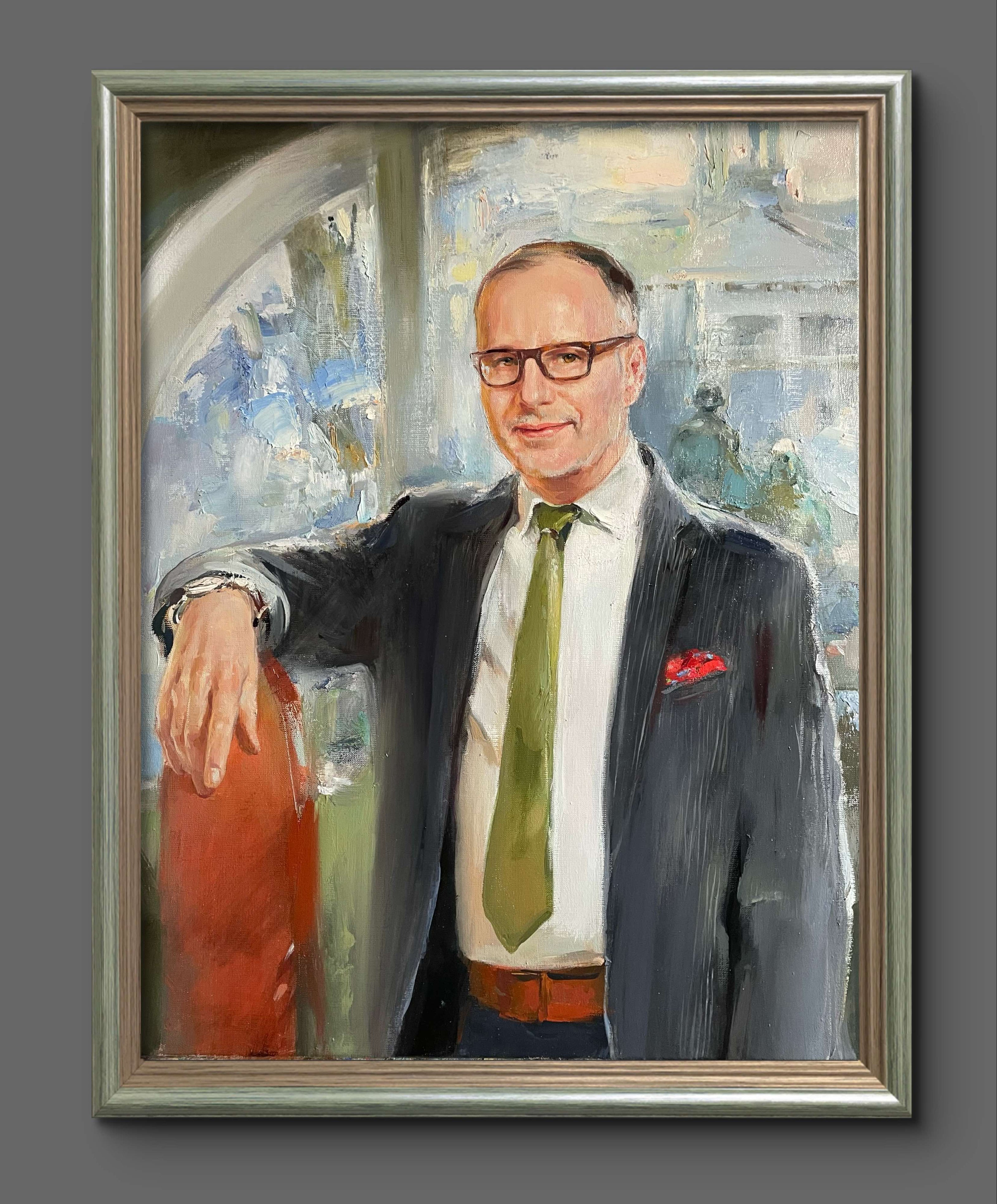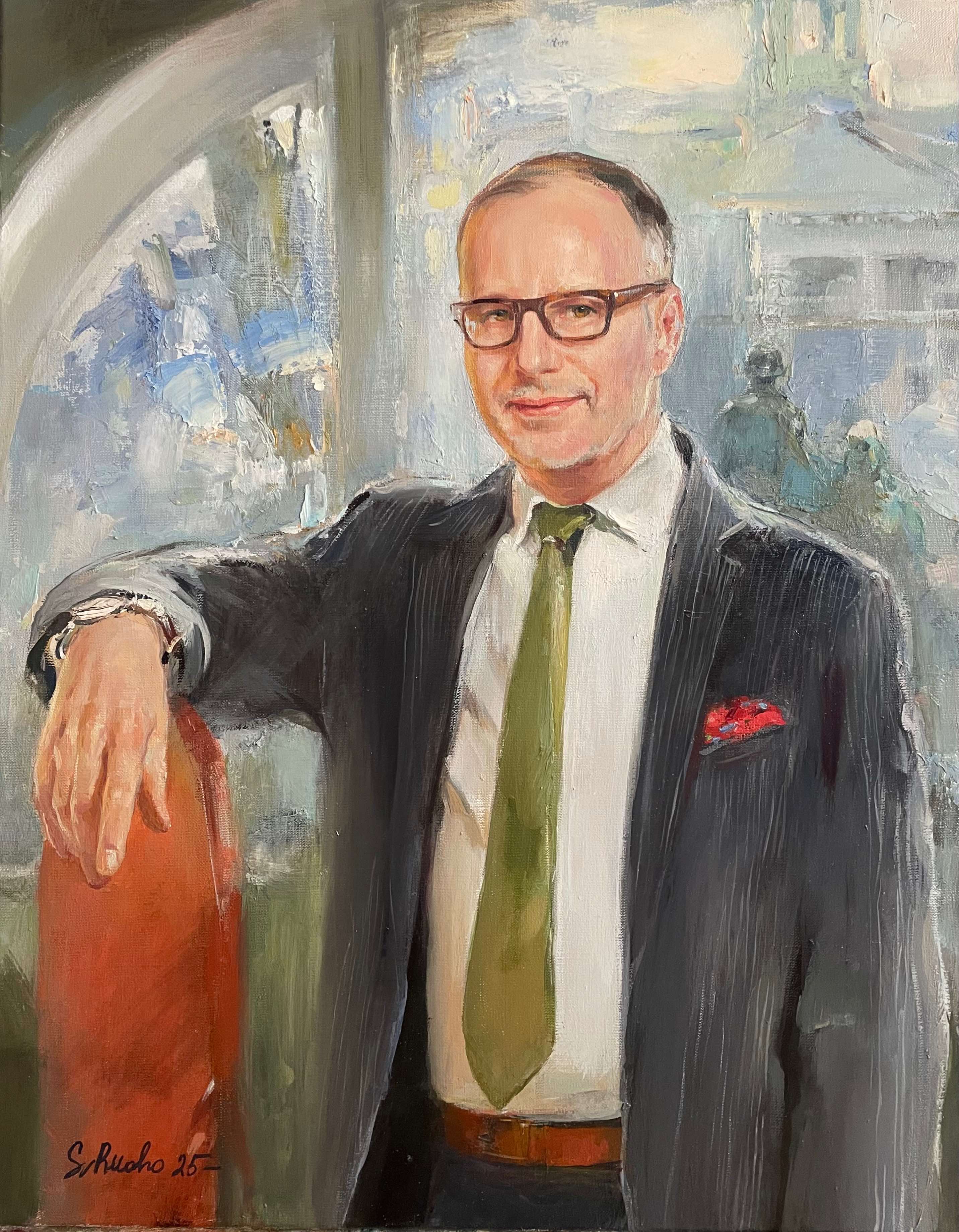 Virallinen muotokuva Ressun lukion rehtorista Ari Huovisesta on elävä ja maalauksellinen, yhdistäen henkilökuvan ja lukion arkkitehtoniset piirteet. 2025.