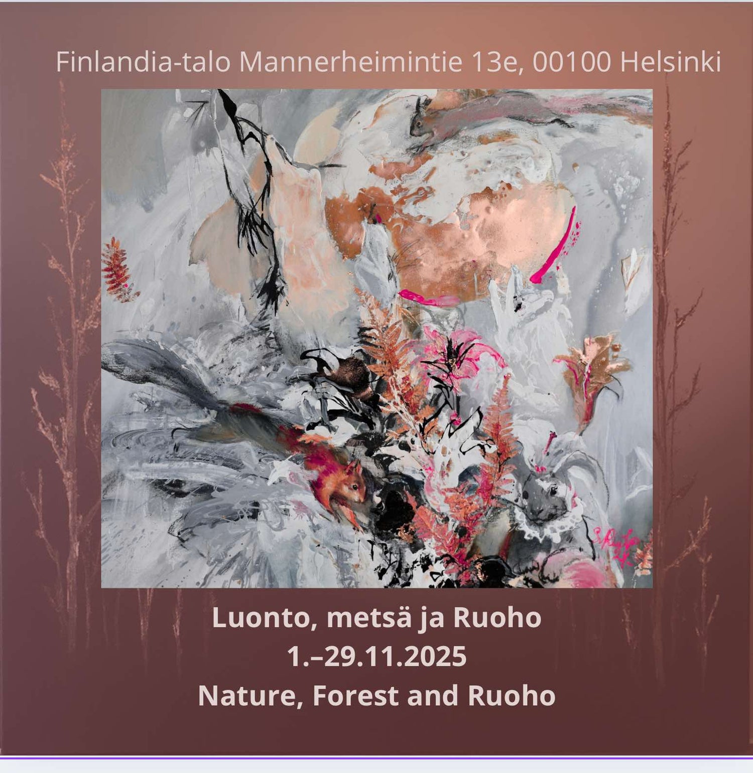 Kuvataiteilija Svetlana Ruoho esittelee Finlandia-talossa luontoaiheisia maalauksia.
