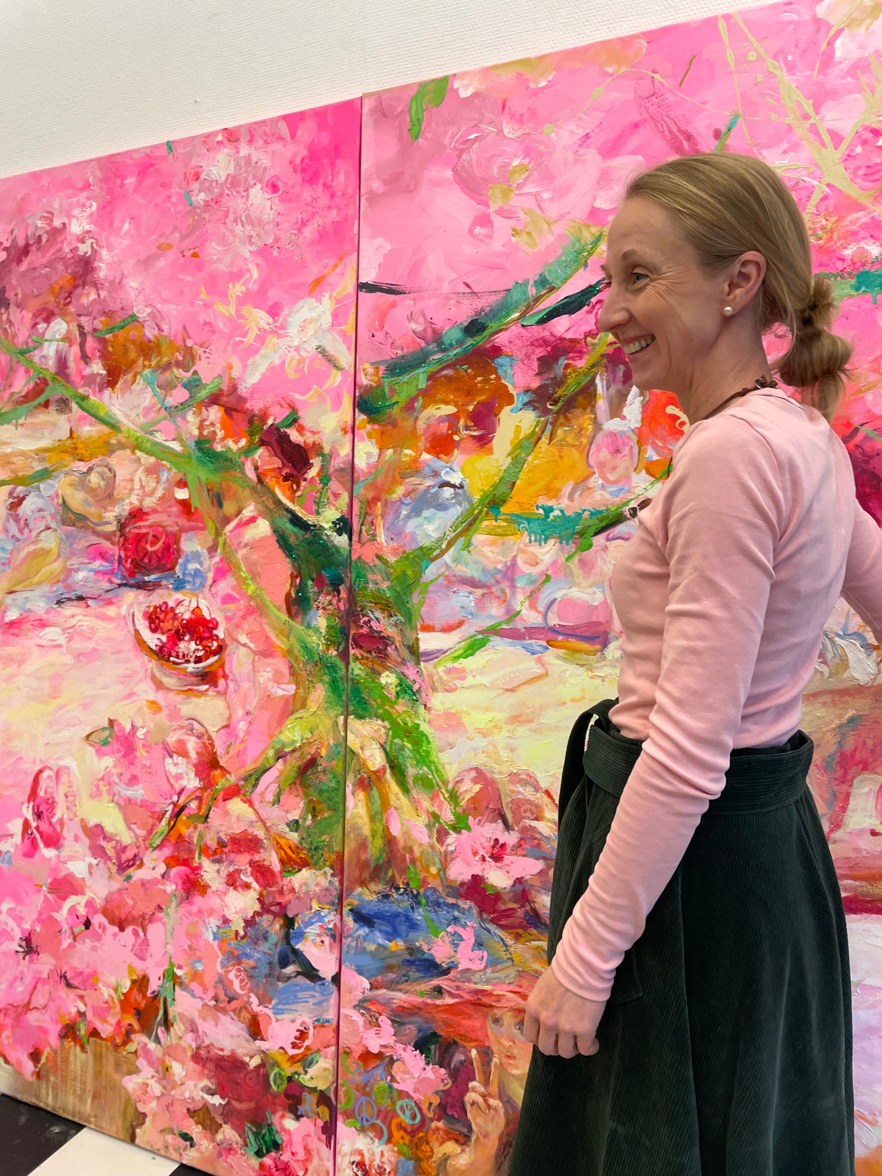 Kolme suurta, kirkkaan vaaleanpunaista teosta maalaussarjasta Turva, Rakkautta ja Pinkkejä ovat esillä Munkkiniemen taidelainaamossa marraskuussa 2025.