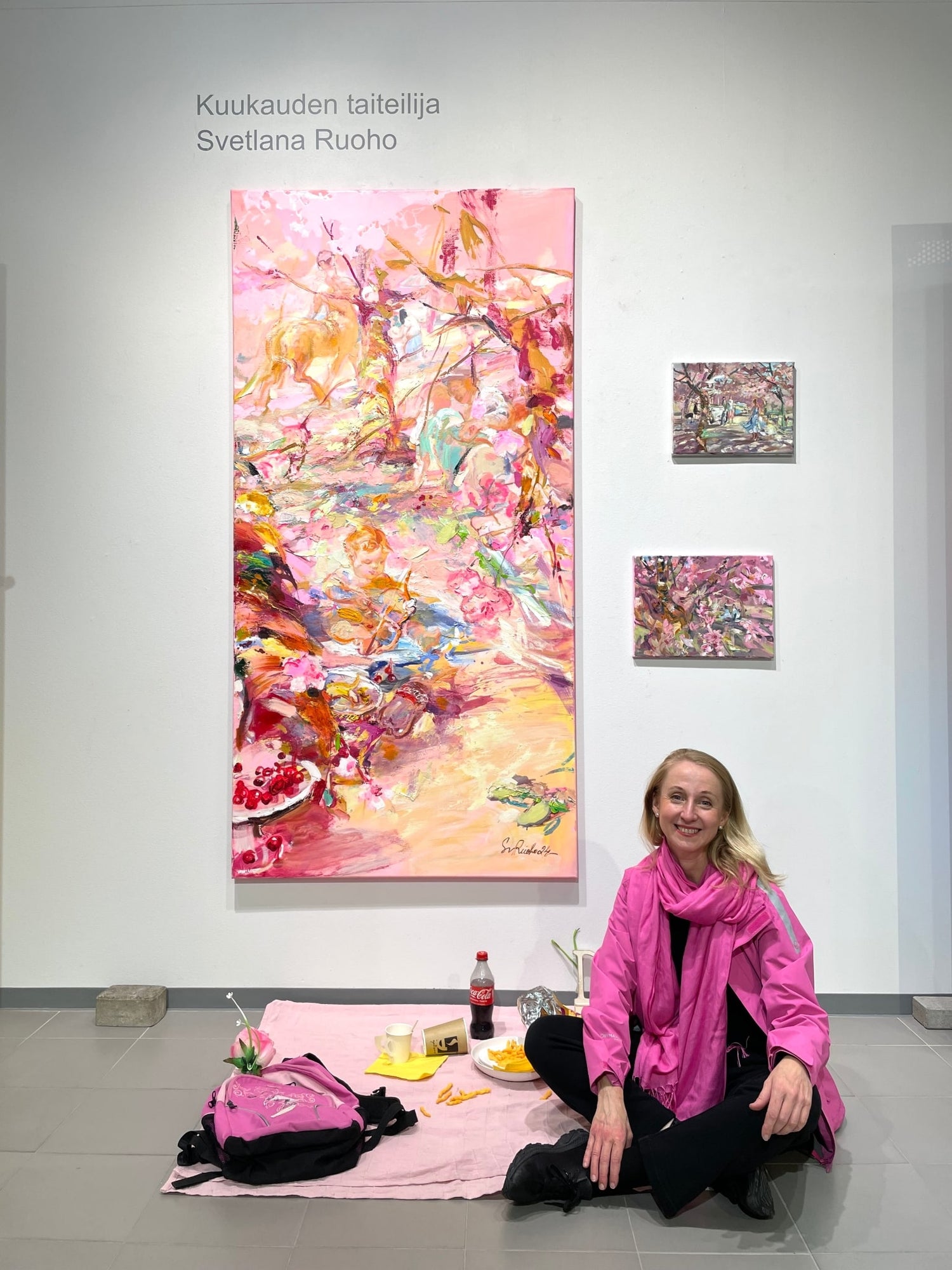 Tervetuloa paratiisiin piknik tunnelmalle Espoon taidelainaamon. Espoon taidelainaamossa lokakuussa 2024 minulla on kuukauden taiteilijan näyttelyni. Esillä on useimpia teoksia: Isompaan kokoinen teos ”Paratiisin puistossa” 200x 100 cm ja kolme pienempää maalausta, joille sain inspiraatiota kirsikkapuiston kukinta kaudesta.
