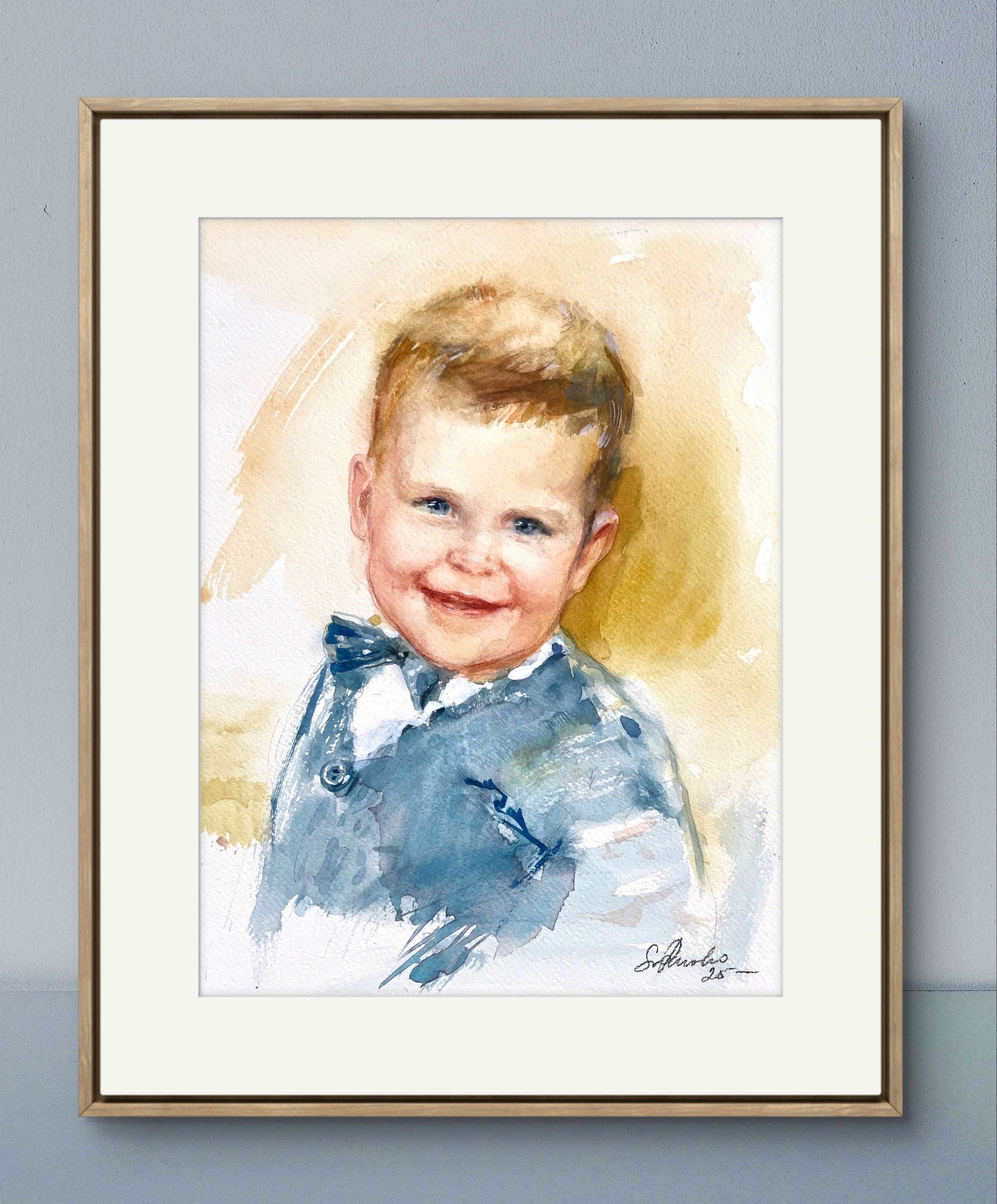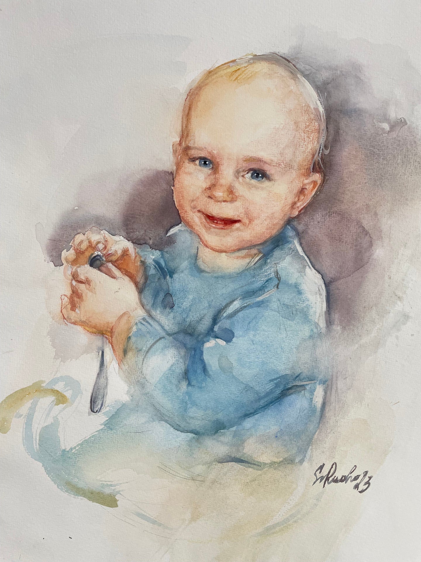Tilausmuotokuva 1 v lapsisesta. Muotokuva on tehty valokuvan pohjalla. Tekniikka: akvarelli, kynät taidepaperille.