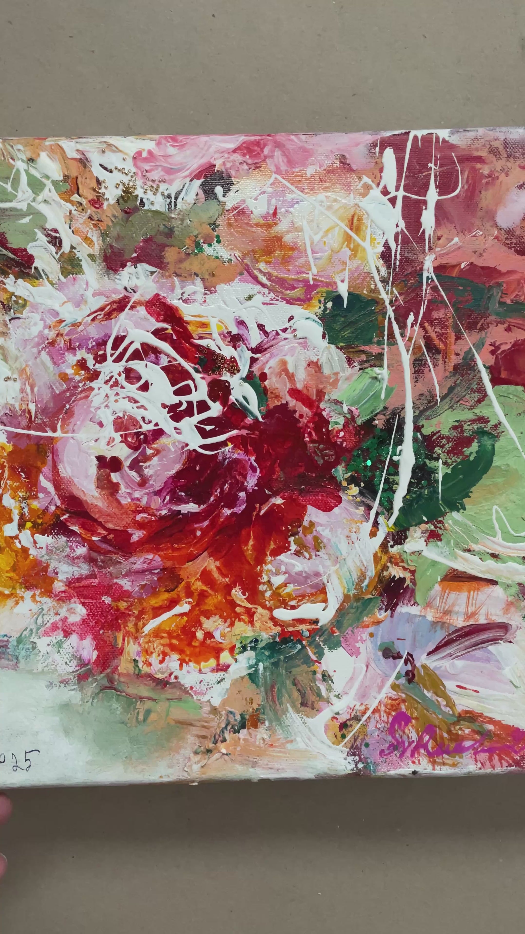 Värikäs pionimaalaus. Sopiva kokoinen kukkataulu, joka tuo kontrasteja ja väriä kotiinne. Ainutlaatuinen taidelahja. Akryyli, öljy, glitteri kollaasitekniikalla kankaalle.